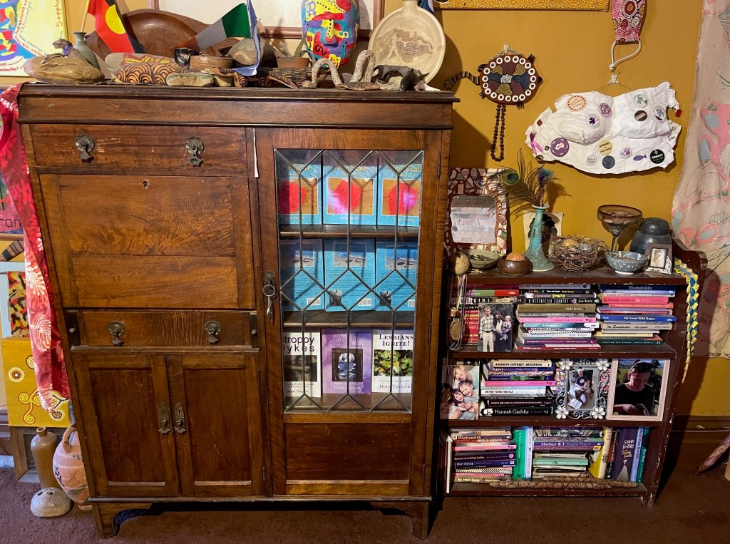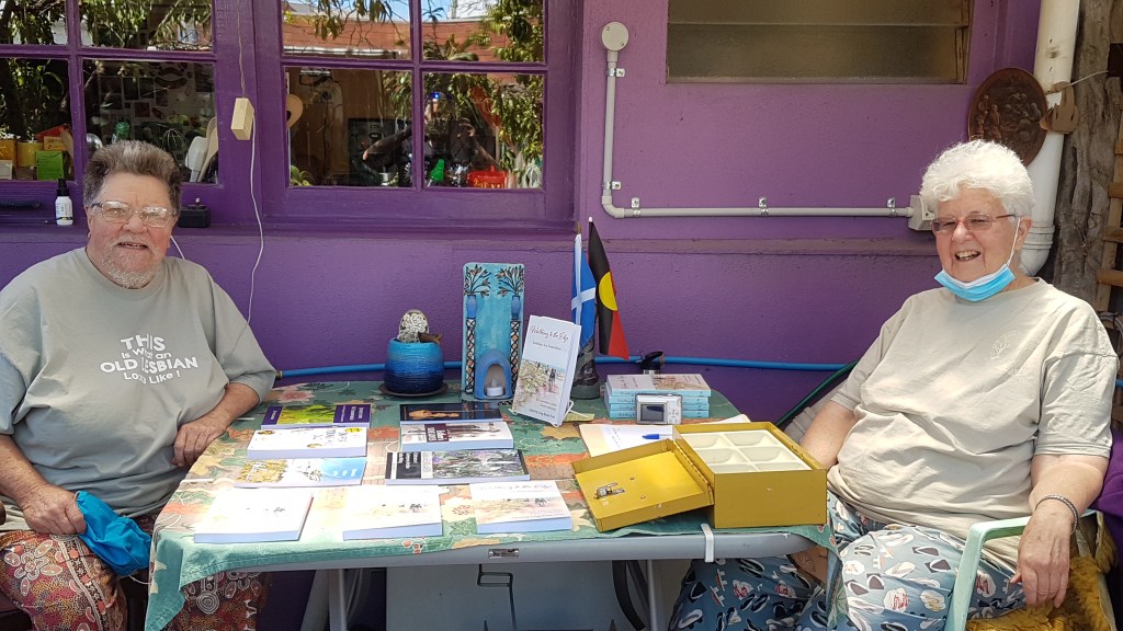 This photo shows Ardy and Jean, two of the founding members of another community based, not for profit, lesbian feminist publishing group, the Long Breast Press Inc collective, 2005 – 2025, at the book launch outside on the verandah of LBP’s 7th publication, Walking to the Edge, Lesbians Are Everywhere: An Australian Lesbian Travel Anthology, in 2020 during a window of opportunity in the midst of the rolling COVID19 lockdowns in Naarm; photo by a friend.