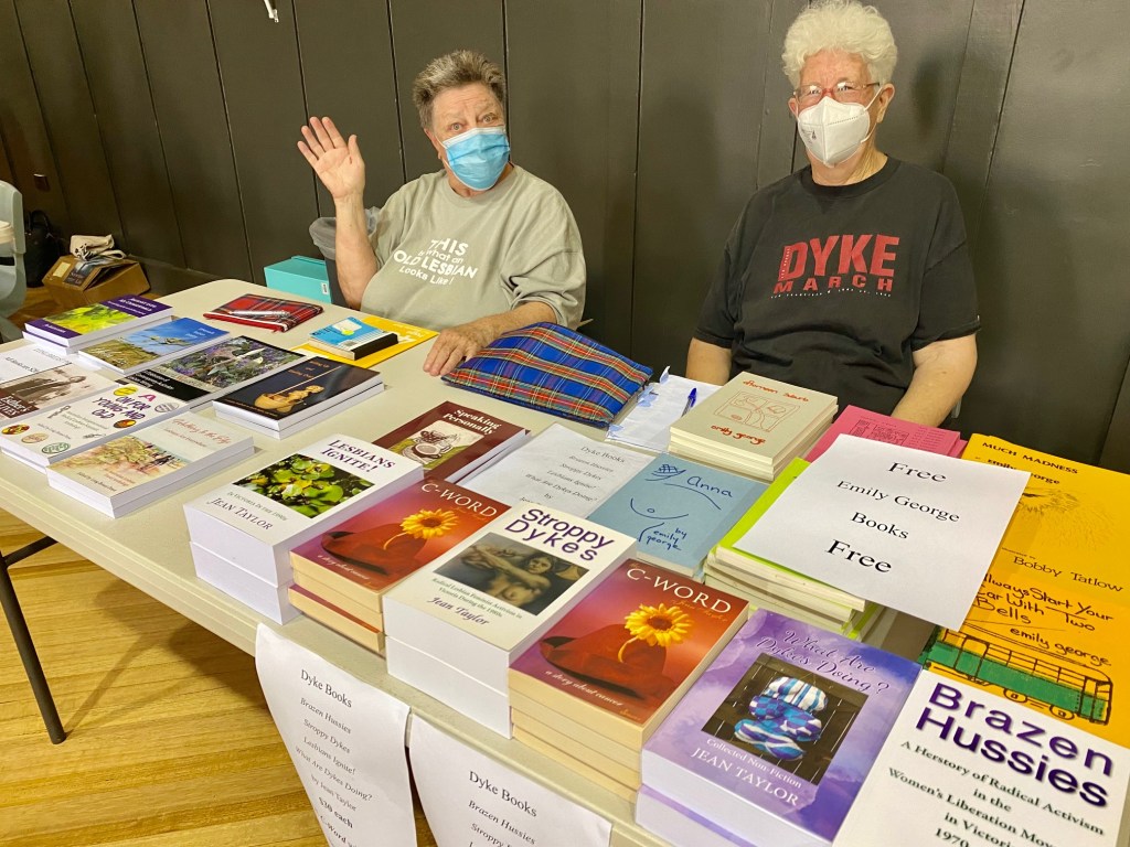 The this photo is of one of the founding members of Dyke Books Inc, Ardy Tibby, and the founder, writer and publisher, Jean Taylor, at a Matrix Guild Lesbian Literary event in 2022 where they were selling or giving away books by Emily George, Long Breast Press Inc, Dyke Books Inc and Jean’s book, The C-Word, published by Spinifex Press; photo by a friend.